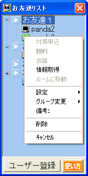 | 「お断りに登録」 | … | このグループに登録したユーザーから送信された会話が表示されず、対局申込を自動的に辞退します。 |