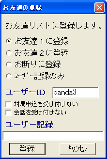 お友達リストに登録する場合、[ユーザー登録]ボタンをクリックしてお友達の登録画面が表示されたら「お友達1に登録」「お友達2に登録」「お断りに登録」「ユーザー記録のみ」からどのグループに登録するか選んで、ユーザーIDの欄にユーザーIDを入力して[登録]ボタンをクリックしてください。