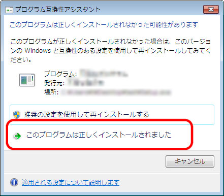 「このプログラムは正しくインストールされなかった可能性があります」とういう表示がでた場合