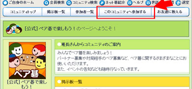 | [ 3 ] コミュニティを見て、気に入ったらそのコミュニティに参加しましょう。ページ上にあるメニューの中から“このコミュニティへ参加する”をクリックします。 |