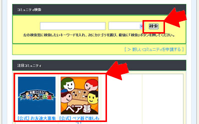 | [ 2 ] 「コミュニティ」の一覧画面が表示されます。ここからさらにご希望のコミュニティを探します。 |