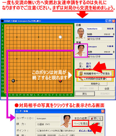 | [ 2 ] 一度も交流の無い方へ、とつぜんお友達申請をすると、相手がびっくりして失礼になってしまうこともあります。まずは一度対局を申し込むなどして交流を始めましょう。 いつも対局されている「対局専用ソフト」で対局をして最後に終局すると、対局画面に“対局ページを見る”というボタンが現れますのでそこをクリックします。 または、対局相手の写真部分をクリックすると、その方のプロフィール画面が表示され、そこにある“ページを見る”ボタンをクリックすることでも同じです。 |