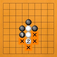 13図を見ていただきましょう。石は自分の天地左右4カ所を相手の石に囲われれば、盤上に存在することができません。つまり、取られてしまいます。今、白石が風前の灯になっています。この白石は左右と上の三方を黒石に囲われています。黒の立場で言えば、次に×印に黒が打てば、白石を取り上げることができるのです。