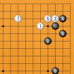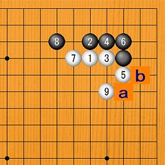白1に黒2、4のツケ引きから黒6とトンで隅の実利を確保し、白7と上辺にヒラいて一段落です。白7は左上に白がいるような状況の場合、白aと高くヒラくのも有力です。隅の黒はしっかりした形なので、このあとの右辺の価値は小さくなります。
