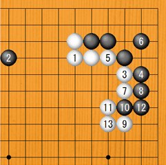 白1のツギに対して、黒2と上辺をヒラくのは白3とツケられます。黒4から白13までは一つの形ですが、黒は低位に押し付けられ、白は厚くなりますから、特殊な状況をのぞいて、3図黒6のトビを手抜きするのはよくありません。