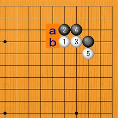 白1、黒2のときに白3から5と打ってくる可能性があります。このあと黒aと打てば大ナダレ定石、bとハネれば小ナダレ定石となりますが、そのように打つと、高段者でも理解するのことができないほど、難解な変化になってしまいます。