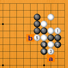 白1に黒2とツケると、白3のハサミツケでサバかれてしまいます。続いて黒aには白b、黒bには白aとなり、あまり黒のよい進行にはなりません。