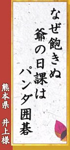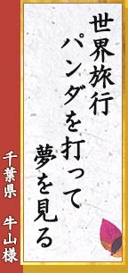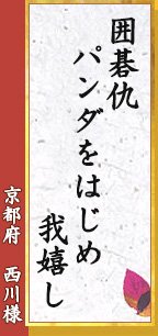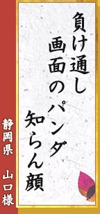- ※ご応募いただいた川柳につきましては、入賞作品または入賞作品以外でも、後日のパンダネットメールマガジンや、ホームページ上、抽選プレゼントの特製カレンダー等、パンダネット運営内の催しにて使用(作品をご紹介)させていただく場合がございます。ご了承くださいます方のみご応募ください。