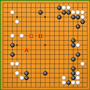 まず、左辺の石を補強するならばだいたいこの形、A。