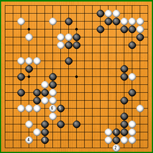 黒3からギリギリの攻防です。模様の碁は一路違うだけで何目も変わります。