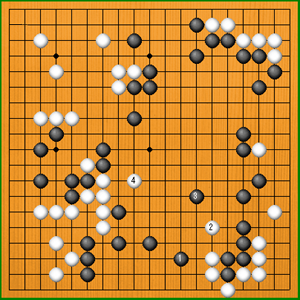 ちなみに、白2で大ゲイマに打つと黒3以下フリカワリになりますが白が全然ダメです。 |
