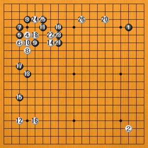 白12で左辺にヒラかなかったので、黒13のハサミは当然です。黒21と攻めたときに、白22、24で先手をとって、白26とヒラいたのが、“シノギの坂田”流の頑張った手です。