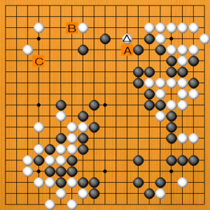 黒1(C)の肩ツキが、ぜひとも打ちたい好点でした。白2と押すなら黒3とノビて、左辺の白の拡大を防ぎながら、中に黒地がつきそうです。上辺は白の出方を見て対処するつもりです。
