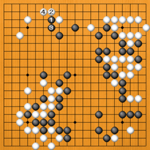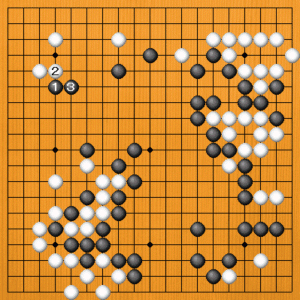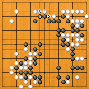 黒△の肩ツキに、白1とコスんで出てきました。黒2の押しから4とカケて、中を止めます。白19のアテに黒20と受けて攻め取りですが、中央がきれいにまとまりました。