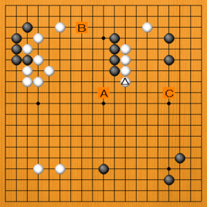 白が△とノビたところです。次の一手を、A~Cの選択肢の中から示してください。