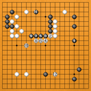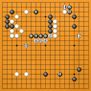 中央の白が強くなると、周りの黒が相対的に弱くなります。黒11と下辺を守れば、白12のカカリで右上の黒に圧力が掛かります。