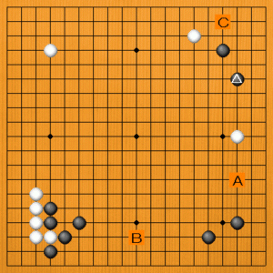 黒△と打ったところです。次の一手を、A~Cの選択肢の中から示してください。