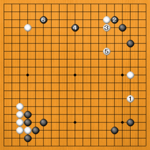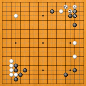 白1のヒラキに、黒2のコスミツケから4とハサんで攻めてくるかもしれません。ここで白5と単に逃げたのでは、黒6とカカって、上辺の黒が安心します。