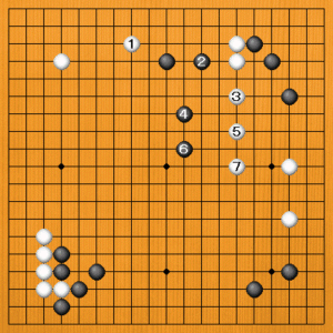 白1とツメて、黒2を待って白3と逃げるのが調子です。黒4に白5、7とトンでいけば、右辺の白と連絡して、自然にいい形を得られます。