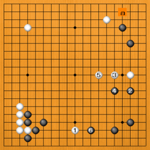 白1(B)と下辺に向かうのは、黒2のツメが絶好点になります。白3とトンで逃げるしかありませんが、黒4のトビで右下がいい構えになります。白5のトビに、黒6と下辺に向かってもいいし、黒aと右上隅をシマるのもいいところです。