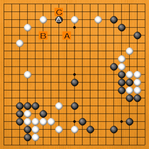黒が△に打ち込んできたところです。次の一手を、A~Cの選択肢の中から示してください。