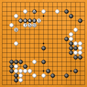 白石がたくさんあるところに、黒が△と打ち込んだのは、やり過ぎでした。白は相手の無理をとがめる必要があります。