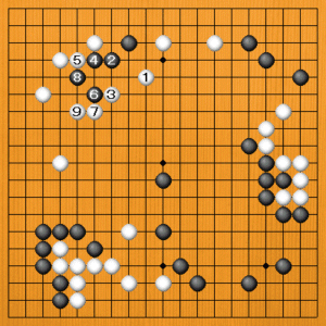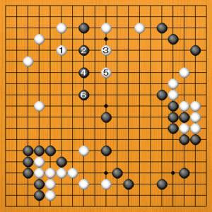 白1(B)のトビは、左上の隅を守る手ですが、黒2とトバれて、この黒は楽になるでしょう。白3、5と後から追いかけても、黒6まで黒が逃げ切りました。