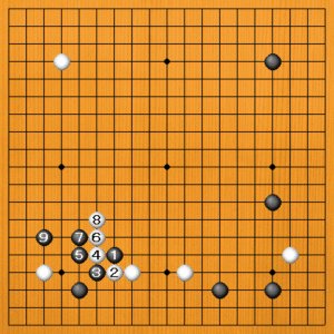 黒1のカケに対して、白2とハザマを突いてきた場合は、黒3と隅にカケるのが好手です。白4と換わってから、黒5とオサえます。白6、8の出切りに、黒9のアテを利かしてから11とノビて、白の応手を問います。