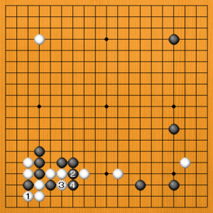 次に、白1とカカえれば、黒2、4と出て行きます。これは下辺の白が分離されて、白がつらい形ですから、黒の成功です。