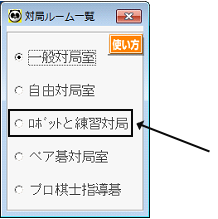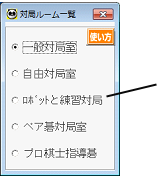 パンダネットに接続すると、パソコン画面左側に左図の「対局ルーム」選択画面が表示されます。対局ルームについて詳しくは下記の「目的別ルーム機能」をご覧ください。 「ロボットと練習対局」をクリックします。 |