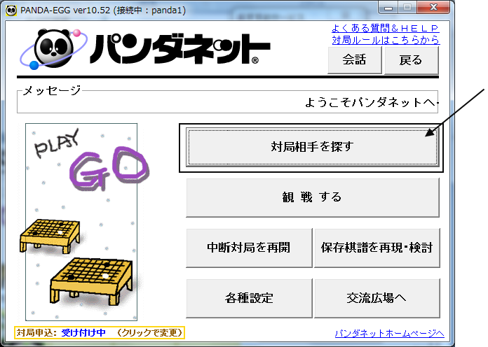 パンダネットに接続すると、画面左側に対局ルーム一覧ウインドウが表示されます。 「一般対局室」や「ロボットと練習対局」などの対局ルーム名をクリックして[対局相手を探す]ボタンをクリックすると、選択した対局ルーム内で対局相手を探すことができます。 |