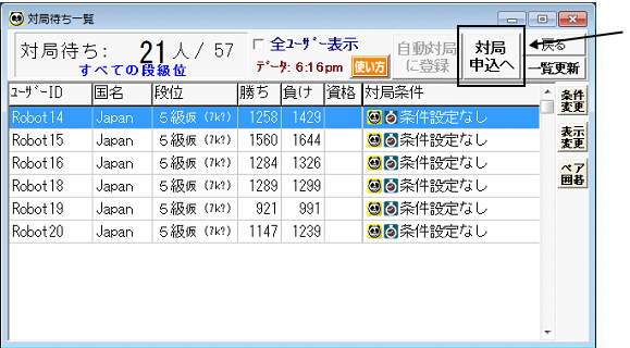 Robot1~Robot30がリストにありますので、いずれかを選択し、[対局申込へ]ボタンをクリックします。