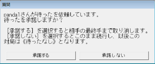 「待った」の依頼を受けた側には[承諾する]か[承諾しない]を選択する画面が表示され、20秒以内にどちらかを選んでいただかないと自動的に[承諾しない]となります。「待った」を辞退すると、その対局は終局まで「待った」なしとなります。