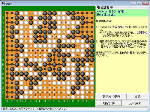 死石をすべて取り除きます。 ×マークの石をクリックすると、碁盤から石が消え、アゲハマとなります。 |