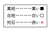 | ※ 死石を取り忘れると、アゲハマだけなくその石の周辺がダメと計算されるため、結果が大きく 違ってしま います。現在の計算結果が目算と異なる場合は、死石を取り忘れている可能性が ありますので、[戻る]をクリックして盤面をよく確認してください。 対局結果が確定すると、結果を訂正できませんので十分ご注意ください。 | |