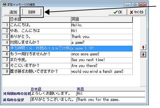 変更したい部分をダブルクリックするとカーソルが表示されますので、メッセージを変更してください。 対局開始時の挨拶と終局時の挨拶を編集することもできます。 |