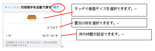 ![]() 右上の「対局相手を自動で探す」をタッチします。 この条件を基に、コンピュータが対局相手を選び、自動的に対局が始まります。 ![]() 条件を確認し終えましたら、「探す」ボタンで自動マッチングを開始します。 自動マッチングで条件に合った対局相手が見つかると、すぐに碁盤が表示され対局がスタートします。 |