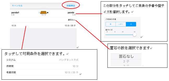 ![]() 画面左上の「対局を申し込む」をタッチすると、そのルームにいる対局待ちユーザーが表示されます。スクロールして、希望の段級位の相手を探していきます。対局者のIDの意右側についている、点「・」は、受付条件を「対局大歓迎」としているユーザーです。 ![]() 希望の相手のIDをタッチすると申込み画面が表示されます。 ![]() それぞれの対局条件を確認した後、右上の「対局申込」をタッチして相手に対局を申し込みます。相手が対局を了承すれば、対局が開始されます。 |