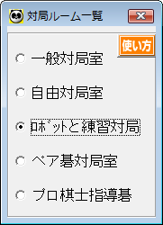 パソコン画面左側にある「対局ルーム」選択画面から“ロボットと練習対局”にチェックを付けます。 |