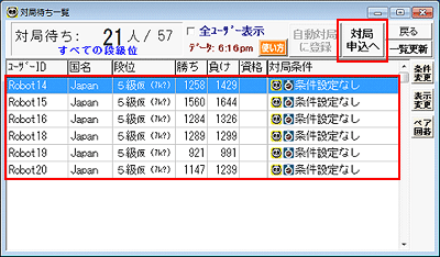 Robot1 〜 Robot10 がリストにありますので、いずれかを選んで右上の「対局申込へ」ボタンを押します。ロボットが別の方と対局中の場合、そのIDは表示されません。 |