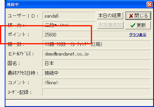パンダネット接続後の画面で[履歴]ボタンをクリックすると、下図のように現在の段級位とポイントが表示されます。