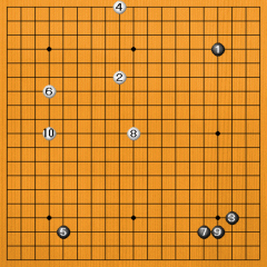【応用】4図を見ていただきましょう。黒と白のどちらがいい打ち方でしょうか。詳しい理屈はまだ必要ありません。感覚的に見ていただきましょう。黒は1~9までゆったりとした雰囲気に思えませんか。それに対して、白は端っこの方に偏っているでしょう。囲碁はゆったりのびのびしていることが大切ですから、黒の方がいい打ち方なのです。黒は黒1、黒3、黒5と黒石があちこちを占めて、碁盤を自由に使っています。しかし、白は白2から白10まで、同じようなところに偏っていて、さらに端っこの方ばかり打っています。窮屈そうでのびのびしていない感じがするでしょう。何となく、そんな感じがすれば十分です。囲碁は感覚で覚えていくことも多いですから、「へー、そうなんだ。何となく分かるような気がする」と感じていただければ、今は十分だと思います。