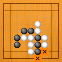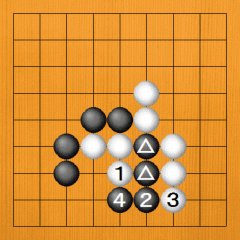 5図、白石が三子になった場合です。これも同じことですが、次の図を見る前に、次の一手を考えて見ましょう。慣れてくれば、パッと見ただけで分かるようになりますが、