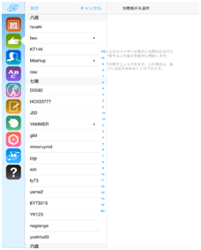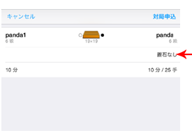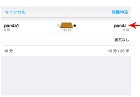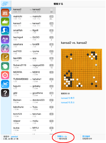 画面左上の「対局を申し込む」をタッチすると、そのルームにいる対局待ちユーザーが表示されます。スクロールして、希望の段級位の相手を探していきます。対局者のIDの意右側についている、点「・」は、受付条件を「対局大歓迎」としているユーザーです。