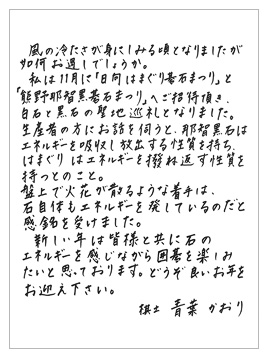 華の女流棋士が、月々入れ替わりで最近の出来事や女流棋士ご自身が振り返る思い出の一局を皆さまにご紹介します。普段は見る事のできないプライベートの写真や直筆の近況のお手紙を掲載しております。