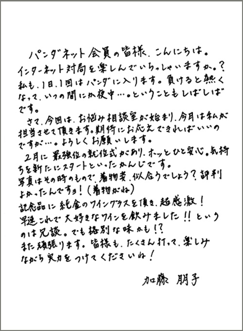 女流棋士の近況報告をご覧いただけます。近況報告では女流棋士のプライベートの写真や近況のお手紙を見ることができます。また抽選で当たる担当棋士からのサイン色紙もご用意しています。応募方法は簡単ですので是非ご応募ください。 続きを読む