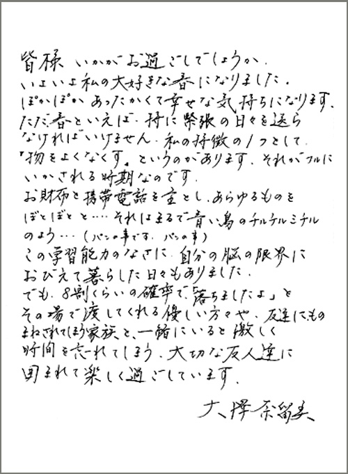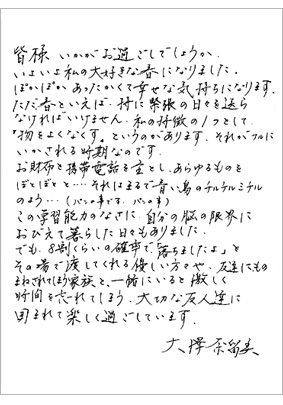 大切な人々に囲まれて楽しく過ごしていらっしゃる大澤奈留美二段の直筆の近況をご覧いただけます。