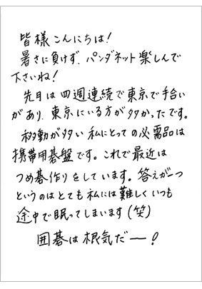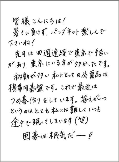 手合のため移動が多いという佃亜紀子四段の直筆のお手紙とと近況写真をご覧いただけます。