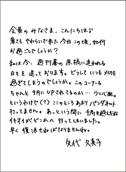 原稿に追われる日々を送っている矢代久美子四段の直筆のお手紙とと近況写真をご覧いただけます