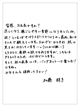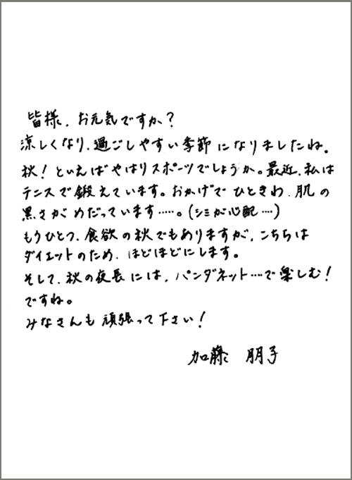 テニスで鍛えていらっしゃる加藤朋子女流鶴聖の近況をご覧いただけます。